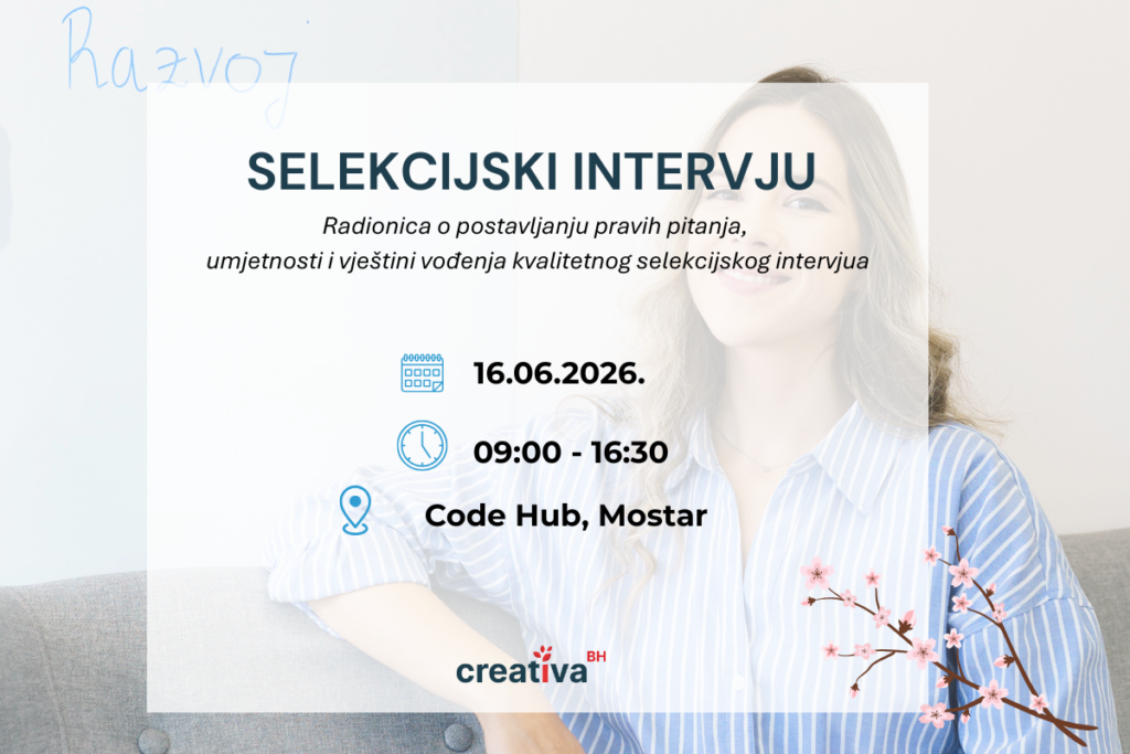 S druge strane, selekcijski intervju predstavlja jednu od ključnih tačaka u procesu zapošljavanja, gdje se u ograničenom vremenu donose važne odluke o ljudima. Kvalitet intervjua zavisi od sposobnosti da se intuicija poveže sa jasnim kriterijima i strukturiranim pristupom. Radionica „Selekcijski intervju “, koja će se održati 16. lipnja 2026. godine od 09:00 do 16:30 sati, fokusira se na razvoj upravo tih vještina, postavljanje pravih pitanja, prepoznavanje kompetencija i donošenje kvalitetnijih odluka. Više informacija i prijava dostupni su na: https://creativa.ba/selekcijski-intervju-16-06-2026-mostar/